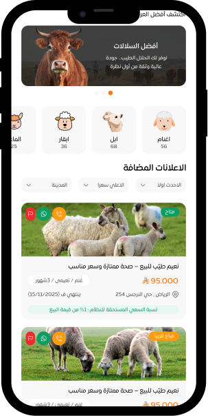 إتاحة عرض المواشي والحيوانات بمختلف أنواعها مع تفاصيل كاملة تشمل السلالة والعمر والحالة الصحية والسعر والموقع.